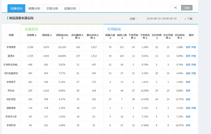 第三步:找到单品,开始点击单品分析,分析单品数据维度,是搜索流量掉了,还是直通车,还是首页,还是免费其他等等。