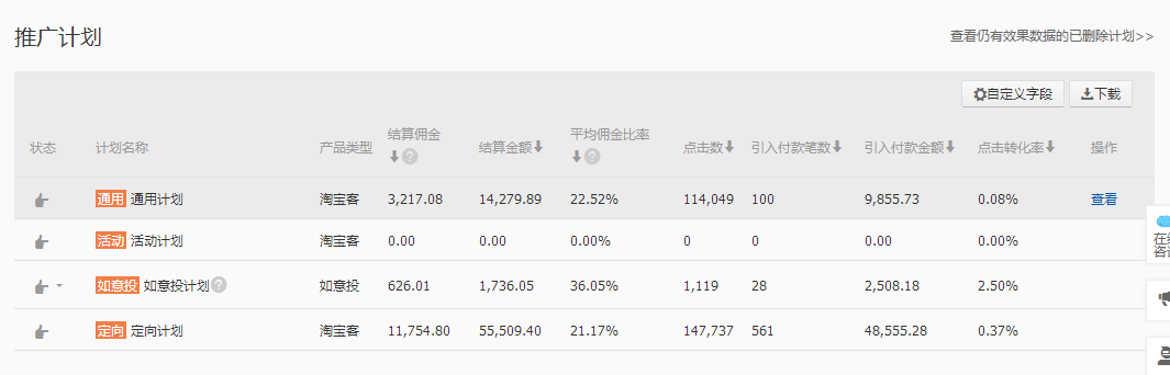 如意投计划:主要展示在爱淘宝,前期需要比较高一些比例的佣金去卡排名这样才能活动更加靠前的位置,还有有一些不开直通车的商家可以用这个计划测款