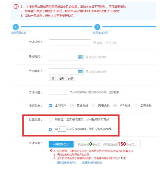 然后我们就得到图4的页面,在红框的位置标有活动内容,有两个选项,一个是“所有宝贝全部收藏后,可以抢购折扣宝贝”第二个是“满_____个宝贝收藏后可以抢购折扣商品”。到这一步大家就明白了吧,我们就是通过买家收藏宝贝以后给买家一定的商品折扣促使买家下单购买,即可以增加我们店铺宝贝增加收藏,也可以促使买家购买折扣宝贝,提高转化。明白原理以后,我们选第二个选项,然后设置收藏宝贝数量,宝贝数量虽然是越多越好,但是我们也不能让消费者感到繁琐,所以一般设置4-6个就可以了,再把前面的标题、时间、标签什么的设置好。然后我们选择需要顾客收藏的宝贝