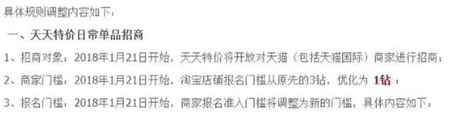 我们都知道很早以前天天特价的报名条件是:只要你的店铺满足了三颗星,店铺动态评分达到要求,基本都是可以申报的,但是后面进行了调整,是需要商家的等级达到三颗钻才可以(具体的大家可以去看天天特价报名规则)。但是2018年1月15日,天天特价又出了新的规则,那就是:天天特价将在1月21号针对天猫/天猫国际商家开始招商。相信,这对很多中小卖家来说又是一个噩耗了,因为这意味着中小卖家不仅要和行业TOP商家竞争,还要和天猫/天猫国际商家竞争。