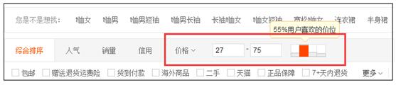 这个是很多时候,是淘宝运营人员界定竞争对手的主要维度,就是同一个价格段位的产品是互相竞争的。这个是比较容易理解的,因为不同的经济水平必然会决定不同的消费档次,这一点在淘宝的搜索结果页面也通过价格柱体现出来。所以,你在界定竞争对手的时候,关于价格层面可以直接通过价格柱去卡!